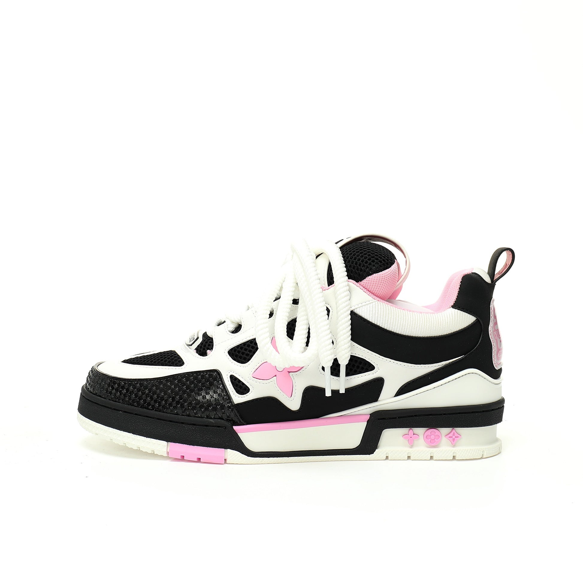 Design e materiali: La tomaia è realizzata in pelle di vitello martellata, spesso combinata con mesh o pelle goffrata effetto pitone, a seconda del modello. Presenta una grande Monogram Flower sul lato e il logo "Vuitton since 1854" sul retro.
